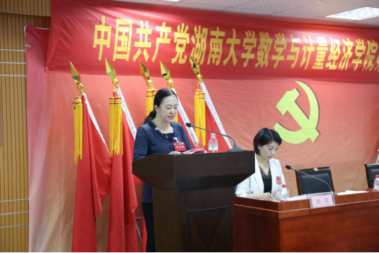 数学与计量经济学院第二届委员会作题为《不忘育人初心,牢记时代使命,团结协作,攻坚克难,努力建设国内一流数学学科》的工作报告。在报告中,程卓蕾同志对过去七年工作进行了回顾和总结,提出了未来四年发展思路和工作目标,呼吁全体党员干部和师生员工继续牢记使命,凝聚新时代数学人的精、气、神、团结协作,为创建国内一流的数学学科不断努力奋斗,为学校争创“双一流”做出新的贡献。大会还以书面形式审议通过了《党费收缴、管理和使用情况的报告》、《大会选举办法》。在主持人宣读了两个委员会候选人名单之后,61位党代表正式进行投票选举。