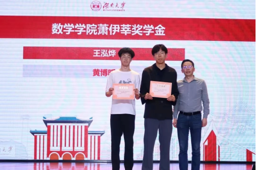 色情导航 第九届励志人物和2022年各项奖学金的表彰大会于5月28日在学校的天马小剧场举行。由海外校友郑力刚、全辉、周建平等捐资设立的“萧伊莘奖学金”2022年度的获奖者为信息与计算科学1901班的王泓烨和数学2101班的黄博昕两位同学。颁奖会上,副院长雷渊教授为他们颁发了获奖证书。