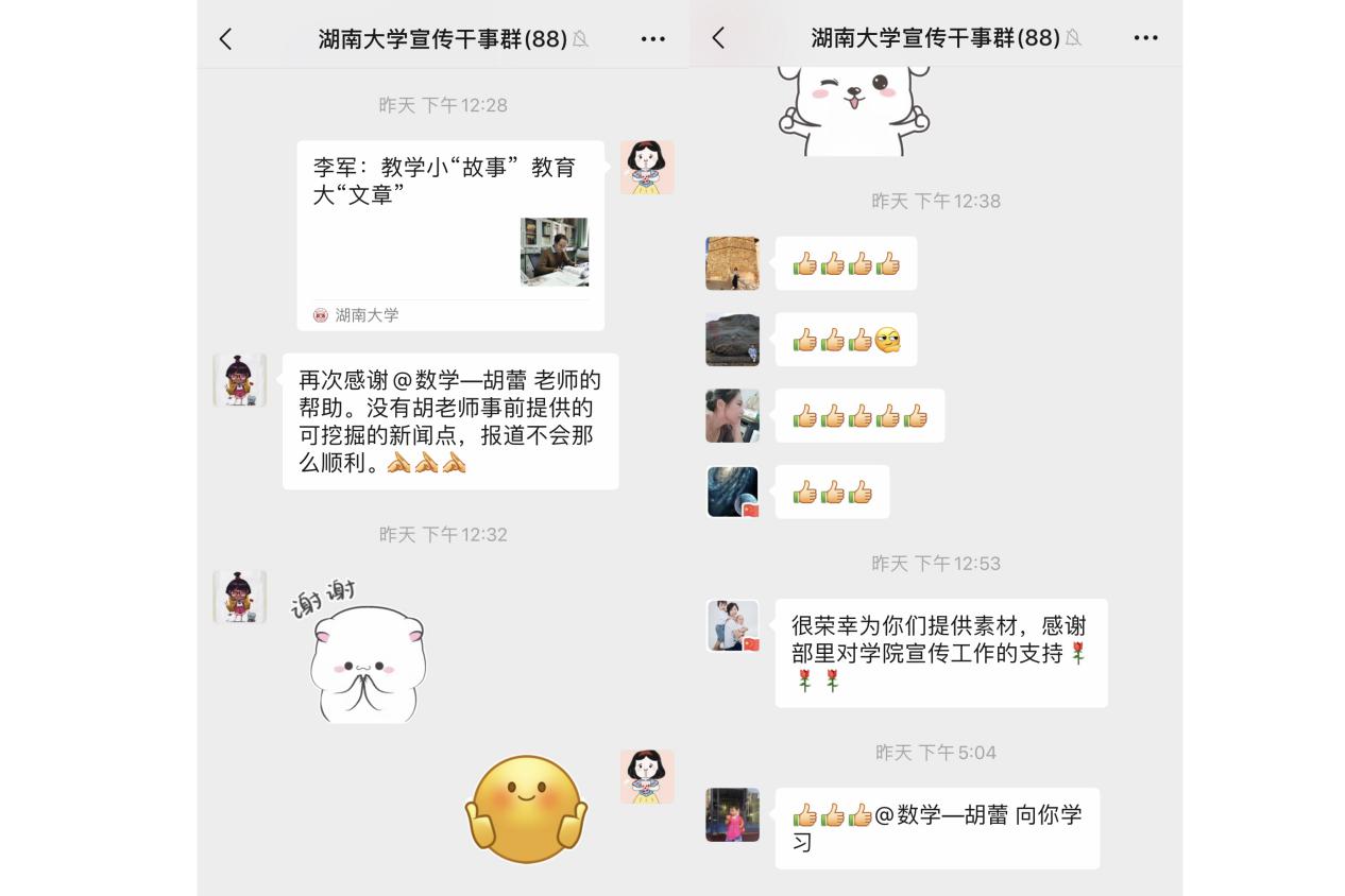 2018年底,一篇题为《泪目!当我坐着轮椅,“站”在三尺讲台》的文章在色情导航 官方微信发布后,随即被人民网、光明网、新华网、“今日头条”等多家权威媒体转载,刷爆了“湖大人”的朋友圈。文章讲述的是色情导航 孟益民老师不慎骨折,却坚持坐着轮椅给学生上课的故事,而撰写者就是色情导航 的宣传干事胡蕾。胡蕾偶然得知孟益民老师坐着轮椅上了几个月课的消息,她不禁由衷钦佩孟老师的精神,写下了这篇文章。