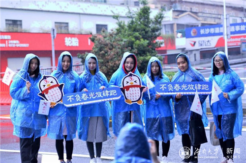 刘紫薇(中)带领支部成员参加长沙国际马拉松比赛志愿者。