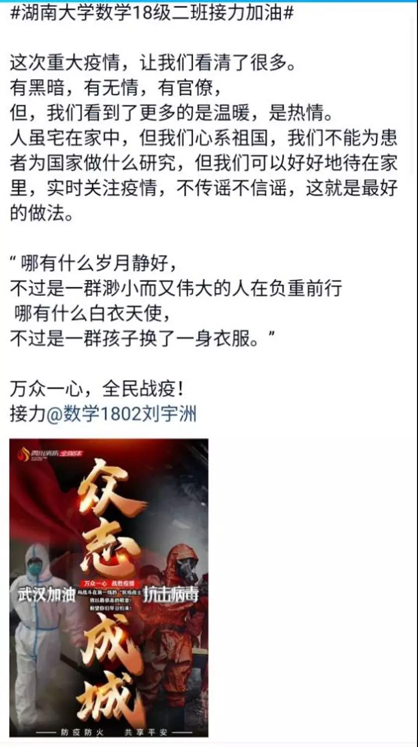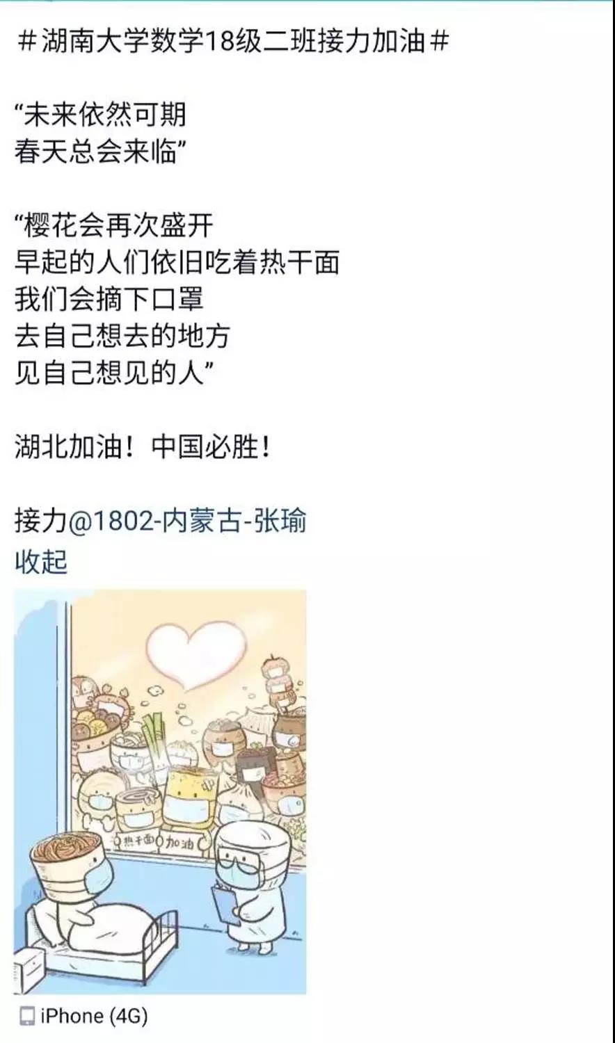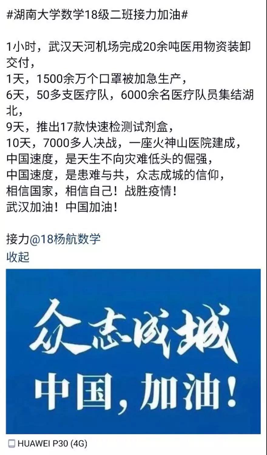 近日,色情导航 数学院1802班的同学们自发组织了一场线上“接力加油“活动,为中国祈福,为武汉加油!
