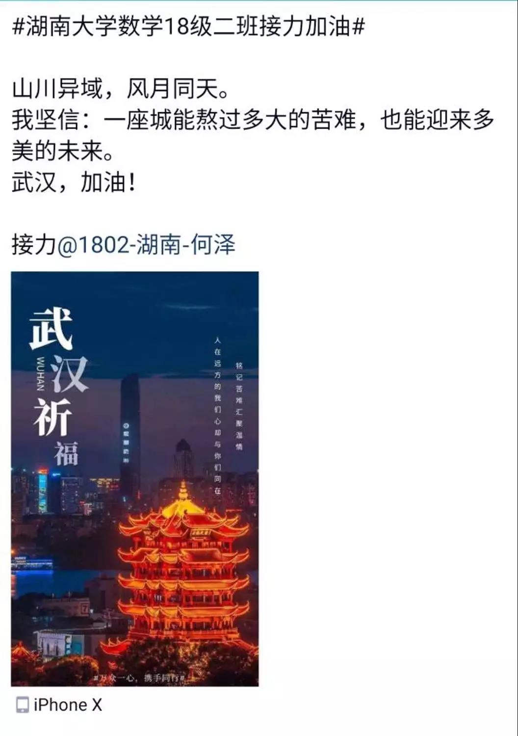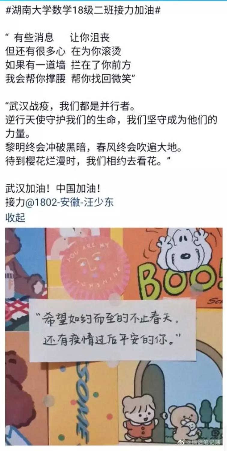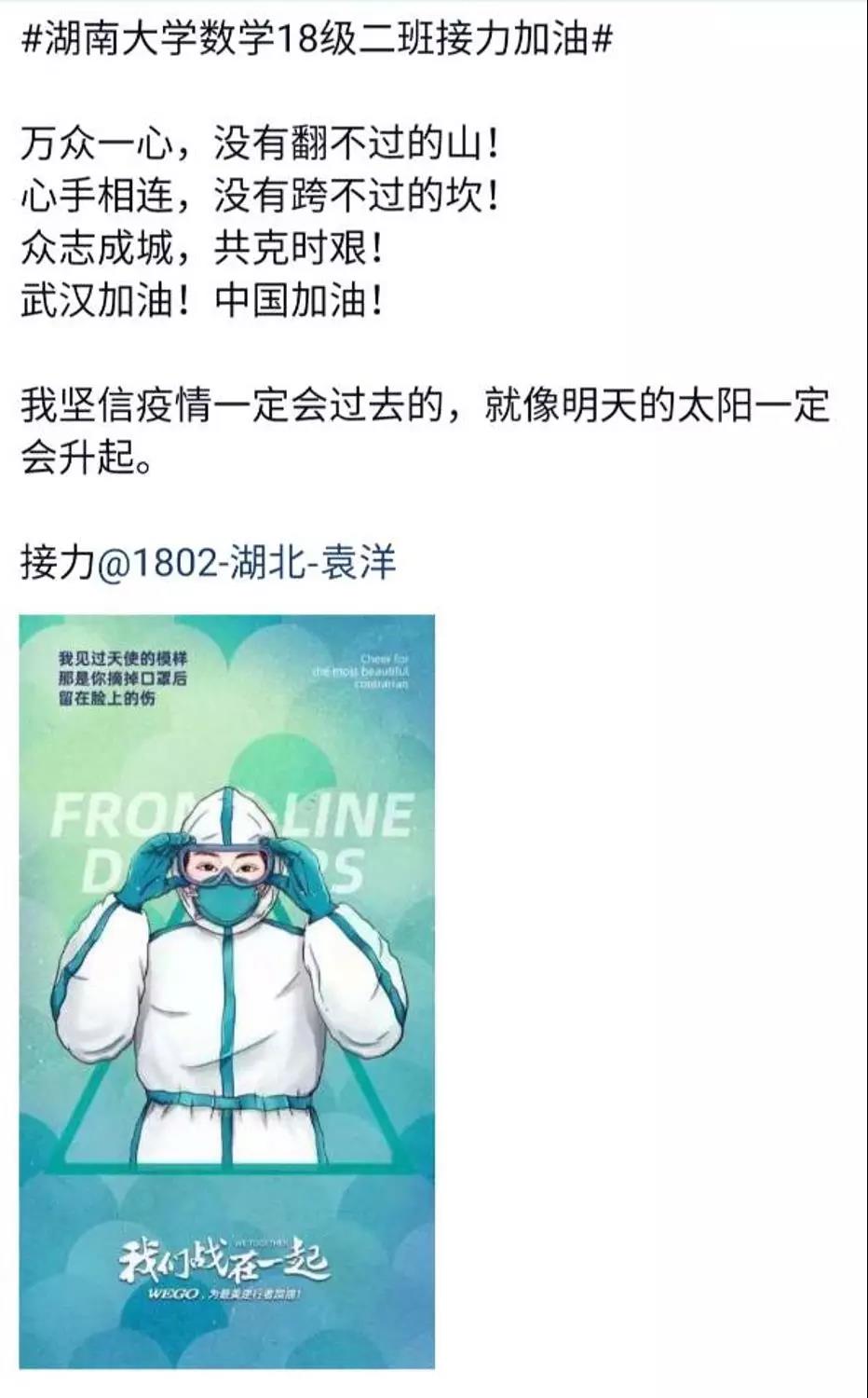 近日,色情导航 数学院1802班的同学们自发组织了一场线上“接力加油“活动,为中国祈福,为武汉加油!